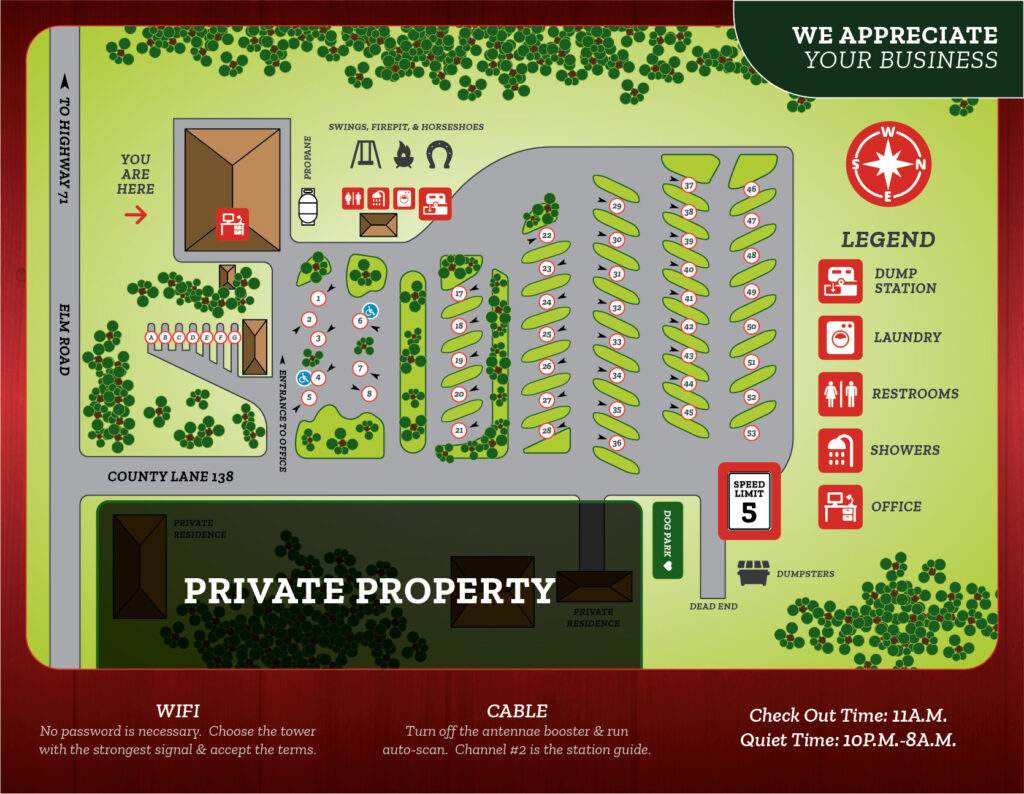 Sites A (Back-in)5,6,8 (5,6,8 have to unhook) &17 (Pull-Through) are Premium Sites- Triple wide, large grassy lawn, large patio, propane grill, personal fire pit & glider